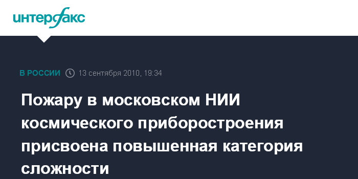 Москва. 13 сентября. INTERFAX.RU - Пожару в здании НИИ космического приборостроения в Москве присвоен повышенный номер сложности, сообщил "Интерфаксу" источник в правоохранительных органах города.