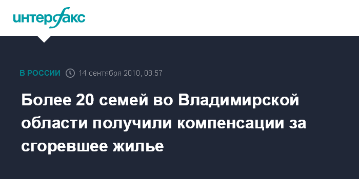 Владимир. 14 сентября. INTERFAX.RU - Во Владимирской области компенсации за жилье и имущество, сгоревшее во время лесных пожаров, получили 22 семьи, сообщила пресс-служба обладминистрации.