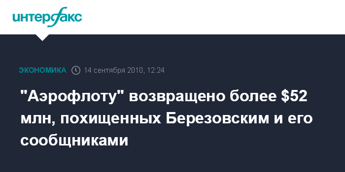 "Аэрофлоту" возвращено более $52 млн, похищенных Березовским и его сообщниками