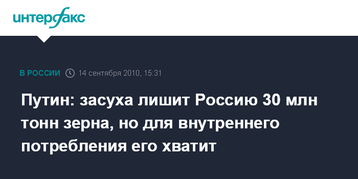 Нижний Новгород. 14 сентября. INTERFAX.RU - Премьер-министр РФ Владимир Путин заявил, что в результате засухи в целом страна может недосчитаться порядка 30 млн тонн зерна, однако отметил, что его у России достаточно для внутреннего потребления.