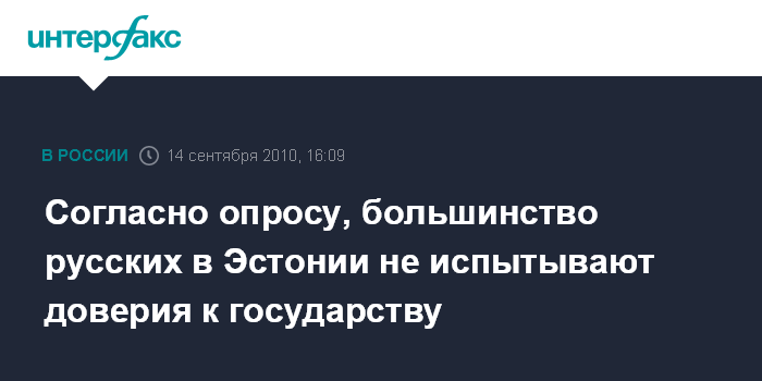 Таллин. 14 августа. INTERFAX.RU - Большинство русскоговорящих жителей Эстонии не доверяют государству, не хотят быть гражданами страны и не интересуются местными новостями, следует из соцопроса, проведенного по заказу министерства культуры Эстонии.