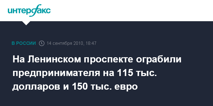 "По предварительным данным, сегодня примерно в 18:20 по адресу: Ленинский проспект, дом 45 трое неизвестных, угрожая пистолетами предпринимателю, похитили у него две сумки, в которых находилось $115 тыс. и 150 тыс. евро, после чего скрылись предположительно на автомашине Mitsubishi Lancer", - сказал источник.