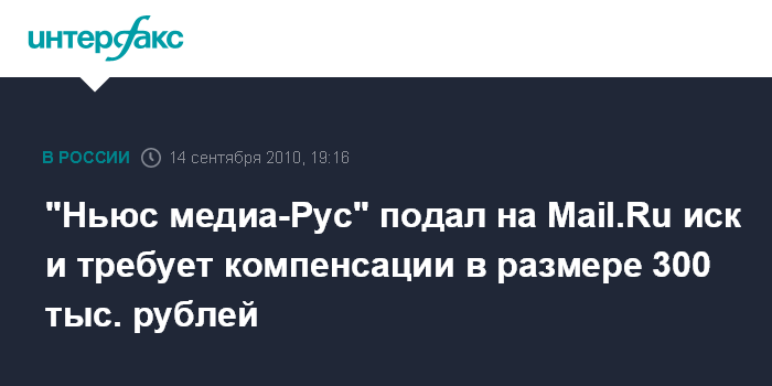 "Ньюс медиа-Рус" подал на Mail.Ru иск и требует компенсации в размере 300 тыс. рублей