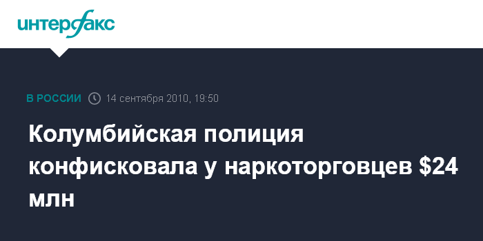 Богота. 14 сентября. INTERFAX.RU - Колумбийские полицейские конфисковали во вторник $24 млн, обнаруженные в автомобиле, принадлежащем местным наркоторговцам, передает местная радиостанция Caracol.