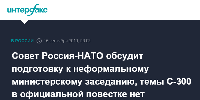 Брюссель. 15 сентября. ИНТЕРФАКС - На первом после летних отпусков заседании Совета Россия-НАТО (СРН) будут обсуждены вопросы сотрудничества РФ и Альянса, в том числе по преодолению общих угроз безопасности; темы ЗРС "С-300" в официальной повестке нет.