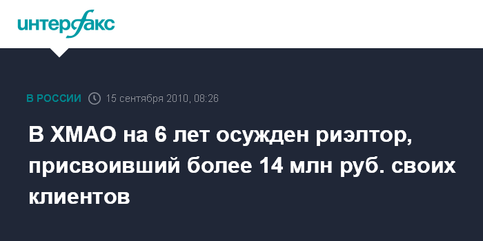 В ХМАО на 6 лет осужден риэлтор, присвоивший более 14 млн руб. своих клиентов