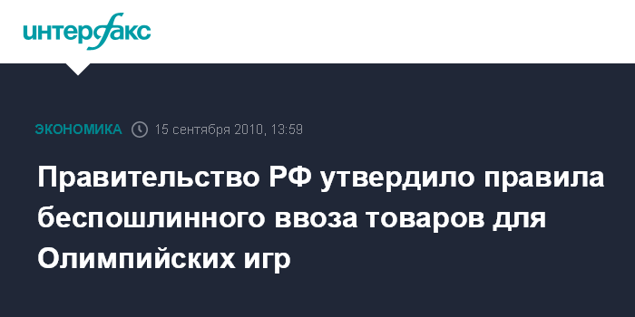 Москва. 15 сентября. INTERFAX.RU - Правительство РФ утвердило правила освобождения от уплаты таможенной пошлины товаров, ввозимых в РФ для использования в Олимпийских играх в Сочи.