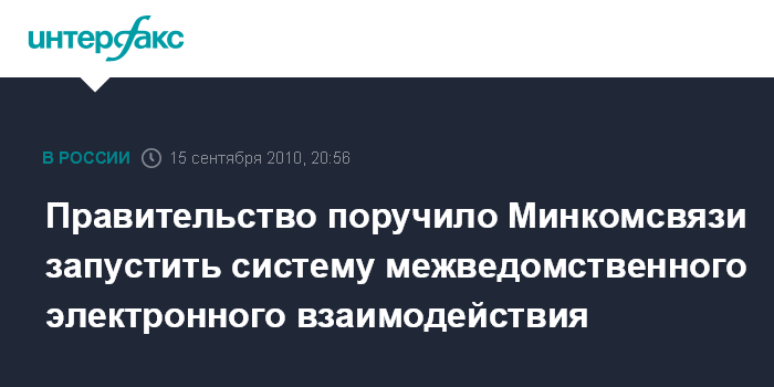 Москва. 15 сентября. INTERFAX.RU - Правительство РФ поручило министерству связи и массовых коммуникаций в 3-месячный срок обеспечить введение в эксплуатацию единой системы межведомственного электронного взаимодействия.