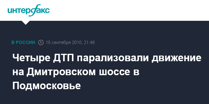 Москва. 15 сентября. INTERFAX.RU - На одном участке Дмитровского шоссе в Подмосковье в течение полутора часов произошли четыре автомобильные аварии, сообщил "Интерфаксу" источник в правоохранительных органах в среду.