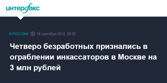 Москва. 16 сентября. INTERFAX.RU - На востоке Москвы задержаны четверо приезжих, которые в декабре прошлого года похитили у инкассаторов более 3 млн рублей, сообщил "Интерфаксу" в четверг источник в правоохранительных органах города.