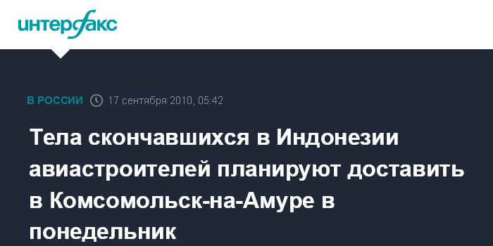 Хабаровск. 17 сентября. ИНТЕРФАКС-ДАЛЬНИЙ ВОСТОК - Планируется, что тела трех сотрудников КнААПО будут доставлены в Хабаровский край в понедельник, 20 сентября, сообщил представитель комсомольского авиазавода.