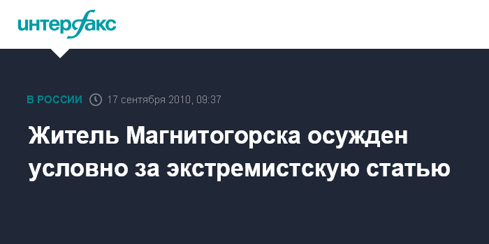 Челябинск. 17 сентября. INTERFAX.RU - Правобережный районный суд Магнитогорска (Челябинская область) вынес обвинительный приговор местному жителю за экстремистскую статью, сообщает пресс-центр облпрокуратуры.