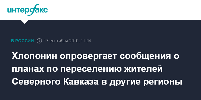 Сочи. 17 сентября. INTERFAX.RU - Полпред президента РФ в Северо-Кавказском федеральном округе Александр Хлопонин назвал провокацией сообщения ряда СМИ о планах по переселению жителей Северного Кавказа в благополучные регионы России.
