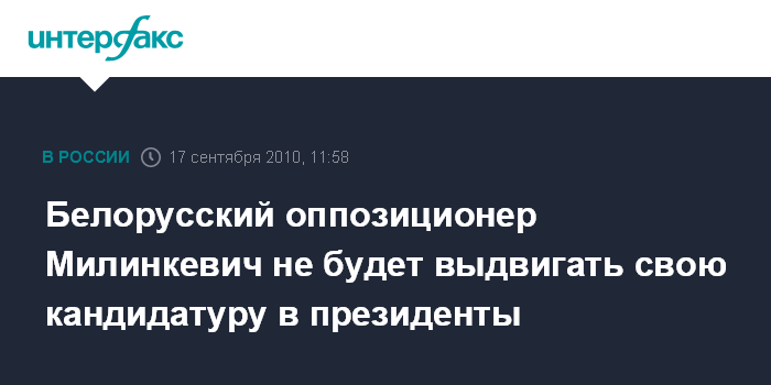 Минск. 17 сентября. INTERFAX.RU - Лидер движения "За свободу" Александр Милинкевич заявил об отказе баллотироваться на пост президента Белоруссии на предстоящих выборах.