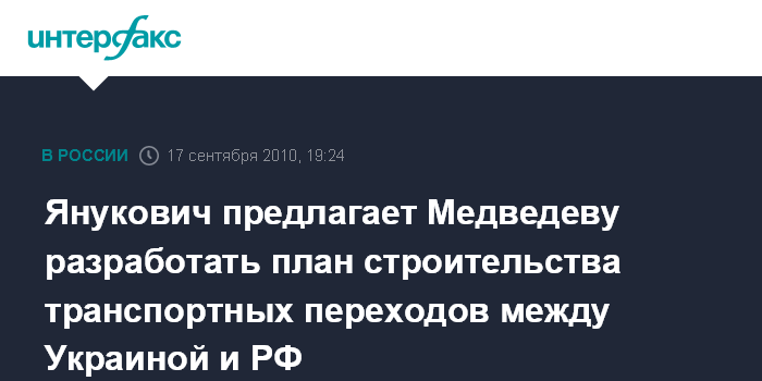 Глухов. 17 сентября. INTERFAX.RU - Президент Украины Виктор Янукович предлагает своему российскому коллеге Дмитрию Медведеву разработать четырехлетний план по строительству транспортных переходов между Украиной и Россией в рамках подготовки к Евро-2012 и Сочи-2014.