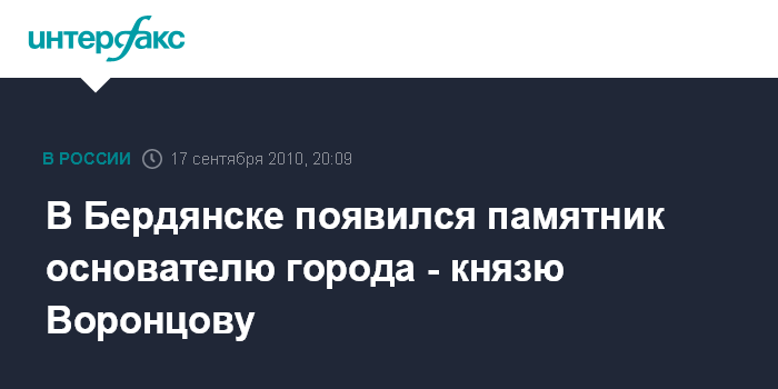 Запорожье. 17 сентября. INTERFAX.RU - Памятник основателю Бердянска князю Михаилу Воронцову открыт в пятницу, 17 августа, ко Дню города.