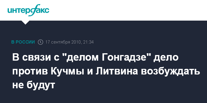 Киев. 17 сентября. INTERFAX.RU - Следователь Генеральной прокуратуры Украины по делу об убийстве журналиста Георгия Гонгадзе вынес постановление об отказе в возбуждении дела против президента Украины (1994-2004) Леонида Кучмы и председателя Верховной Рады Владимира Литвина, сообщает со ссылкой на собственные источники интернет-издание "Украинская правда".