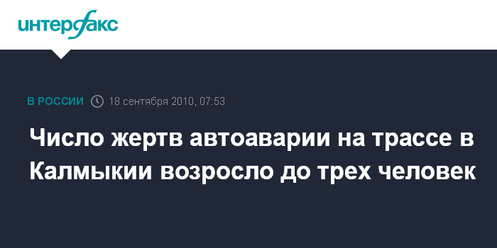 Ростов-на-Дону. 18 сентября. ИНТЕРФАКС-ЮГ - Один из пострадавших в результате дорожно-транспортного происшествия в Яшкульском районе Калмыкии умер в больнице Элисты, сообщили агентству "Интерфакс-Юг" в клинической больнице города.