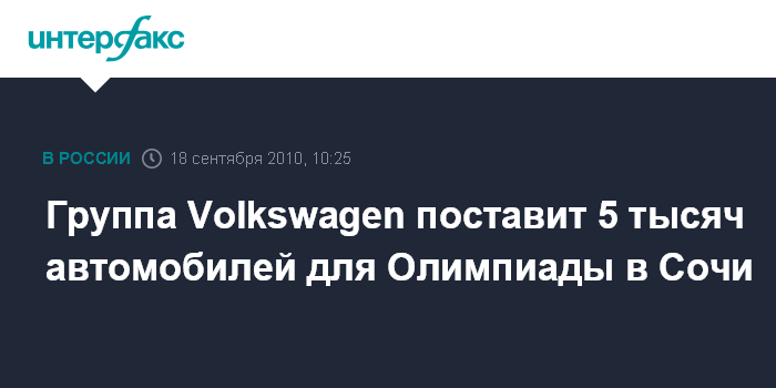 Сочи. 18 сентября. INTERFAX.RU - Группа Volkswagen в субботу передала организационному комитету "Сочи-2014" первые 40 автомобилей, которые будут задействованы в подготовке зимних Олимпийских и Паралимпийских игр 2014 г., всего планируется поставить около 5 тыс. автомобилей. "Год назад заключен партнерский договор с Volkswagen, сегодня поставлена партия из первых 40 автомобилей", - сообщил заместитель председателя правительства РФ Дмитрий Козак на официальной церемонии в субботу. Руководитель Volkswagen в России Дитмар Корцеква отметил, что всего планируется поставить около 5 тыс. автомобилей для Олимпиады,
