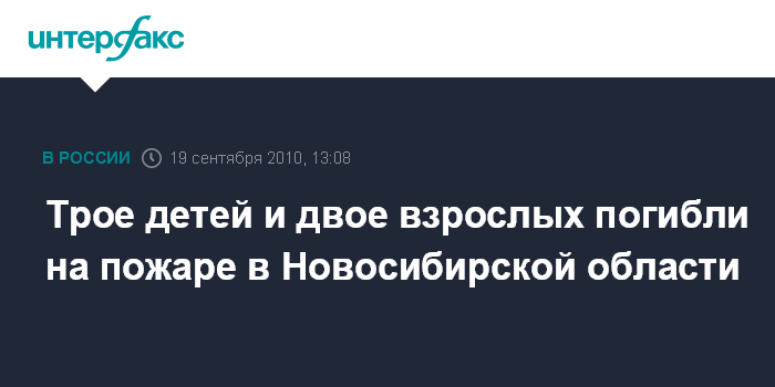 Новосибирск. 19 сентября. INTERFAX.RU - Пять человек, в том числе трое детей, погибли в результате пожара в поселке Чик в Новосибирской области. Как сообщили агентству "Интерфакс-Сибирь" в областном ГУ ЧС, пожар произошел утром в воскресенье в частном жилом доме в поселке Чик. К моменту приезда пожарных дом был охвачен пламенем. После того, как огонь был потушен, под завалами были обнаружены тела погибших - двух взрослых и троих детей.
