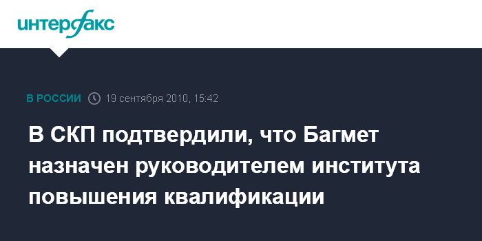 Москва. 19 сентября. INTERFAX.RU - В СКП РФ подтвердили, что бывший глава столичного управления Следственного комитета при прокуратуре Анатолий Багмет возглавил Институт повышения квалификации СКП. "А.Багмет действительно назначен на должность директора Института повышения квалификации Следственного комитета при прокуратуре", - сообщил "Интерфаксу" в воскресенье официальный представитель СКП РФ Владимир Маркин. О том, что государственный советник юстиции третьего класса (генерал-майор) кандидат наук А.Багмет получил новую должность, ранее сообщил "Интерфаксу" высокопоставленный источник в Следственном комитете при прокуратуре РФ.