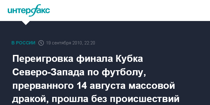 Переигровка финала Кубка Северо-Запада по футболу, прерванного 14 августа массовой дракой, прошла без происшествий