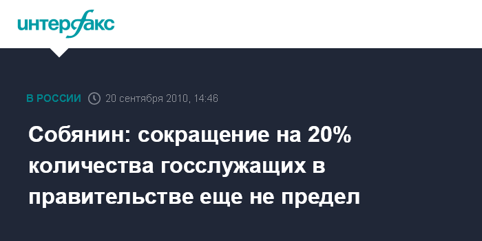 "После сокращения на 20% мы не собираемся останавливать эту работу. Будем очень интенсивно в этом направлении двигаться. Рассчитываем, что это приведет к дополнительному сокращению численности (чиновников)", - сказал Собянин на совещании у президента по оптимизации численности госслужащих.