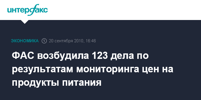 Москва. 20 сентября. INTERFAX.RU - Федеральная антимонопольная служба (ФАС России) возбудила 123 дела по результатам мониторинга цен на социально-значимые продукты питания.