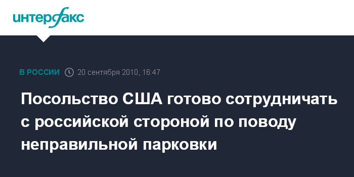 Москва. 20 сентября. INTERFAX.RU - Представители российских властей не обращались в посольство США в Москве с претензиями по поводу неправильной парковки машин дипмиссии, заявляют ее представители.