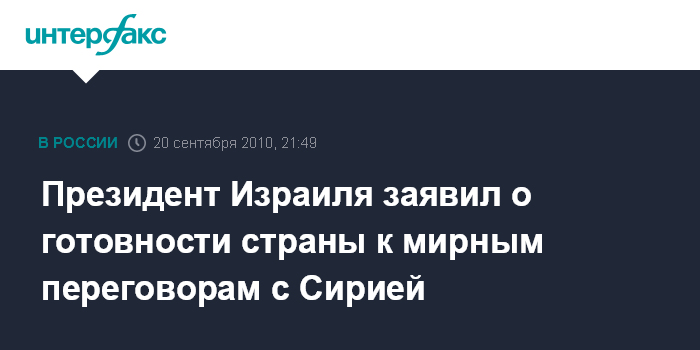 Иерусалим. 20 сентября. INTERFAX.RU - Израиль заинтересован в незамедлительном начале мирных переговоров с Сирией, заявил, выступая в понедельник на Генеральной Ассамблее ООН президент Израиля Шимон Перес.