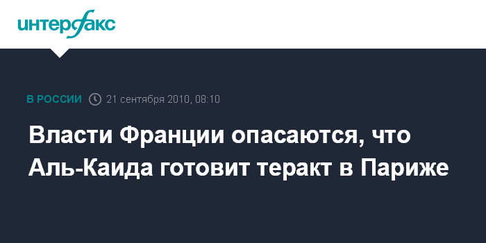 Лондон. 21 сентября. INTERFAX.RU - Французские власти подняли уровень террористической угрозы, получив информацию, предположительно, от разведывательной службы Алжира, об угрозе теракта со стороны "Аль-Каиды", сообщила в понедельник британская газета Daily Telegraph.