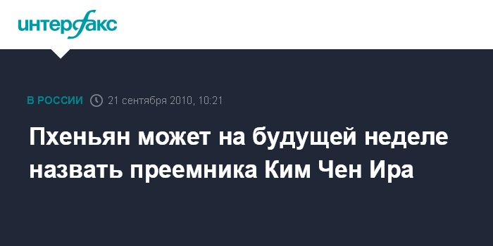 Москва. 21 сентября. INTERFAX.RU - По сообщениям официальных северокорейских СМИ, 28 сентября в Пхеньяне состоится заседание Политбюро правящей партии страны, предполагается, что на нем может быть назван преемник руководителя КНДР Ким Чен Ира. Потенциальным преемником Ким Чен Ира является его третий сын - Ким Чен Ун, сообщает BBC.