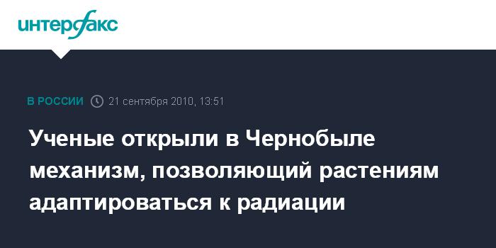 Вашингтон. 21 сентября. INTERFAX.RU - Исследования белков в семенах сои и льна, выросших в радиоактивной зоне Чернобыля, позволили генетикам из Словакии обнаружить механизм адаптации растений к среде с высоким уровнем радиации, пишет во вторник американская газета The New York Times со ссылкой на публикацию ученых Академии наук Словакии в журнале Enviromental Science and Technology.
