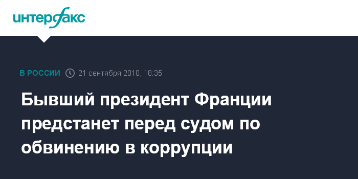 Лондон. 21 сентября. INTERFAX.RU - Бывший президент Франции Жак Ширак предстанет перед судом по обвинению в коррупции, пишет во вторник британская газета The Daily Telegraph.