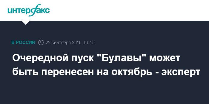 Вашингтон. 22 сентября. ИНТЕРФАКС-АВН - Испытательный пуск межконтинентальной ракеты морского базирования РСМ-56 "Булава" был отложен в середине сентября исключительно по организационным причинам, сообщил агентству "Интерфакс-АВН" в среду бывший начальник Главного штаба РВСН генерал-полковник Виктор Есин.