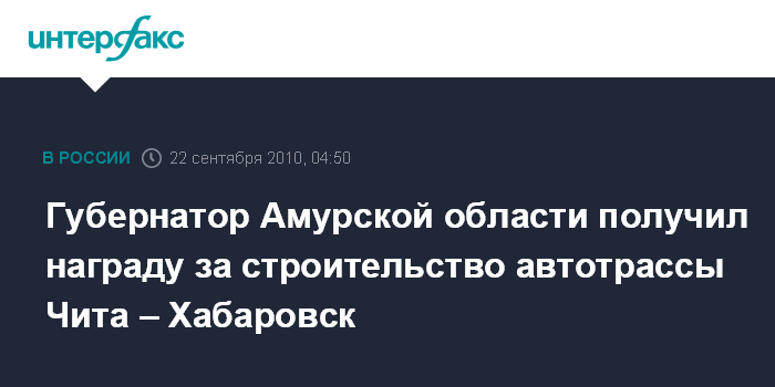 Губернатор Амурской области получил награду за строительство автотрассы Чита – Хабаровск
