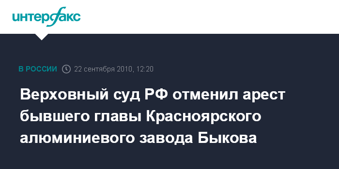 Москва. 22 сентября. INTERFAX.RU - Президиум Верховного суда РФ признал незаконными ряд постановлений, касающихся меры пресечения в виде ареста для экс-главы Красноярского алюминиевого завода Анатолия Быкова, приговоренного за организацию убийства предпринимателя Павла Струганова (Паши-"Цветомузыки").