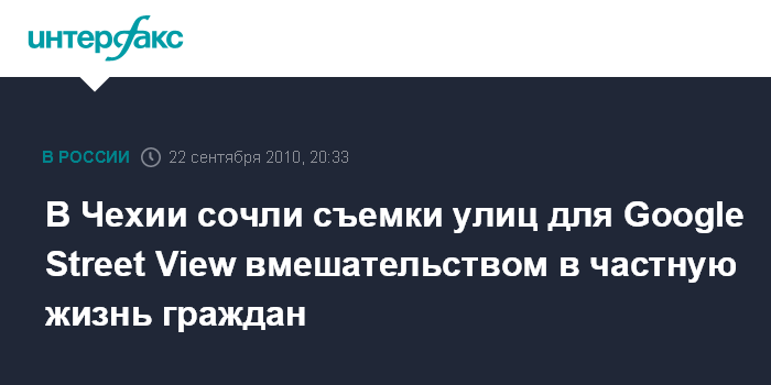 Прага. 22 сентября. INTERFAX.RU - Управление защиты персональных данных Чехии объясняет свой отказ на выдачу разрешения на съемки улиц для компании Google тем, что съемки являются вмешательством в частную жизнь граждан, сообщается в коммюнике ведомства.