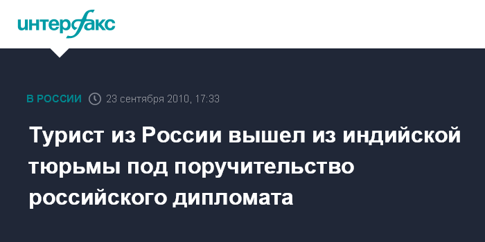 "Турист, обвиненный в нарушении индийского визового режима, отбывал заключение в СИЗО Мумбаи с 20 апреля, и был отпущен 20 сентября. За решеткой он провел, в общей сложности, пять месяцев", - сообщил "Интерфаксу" в четверг генконсул Алексей Новиков.