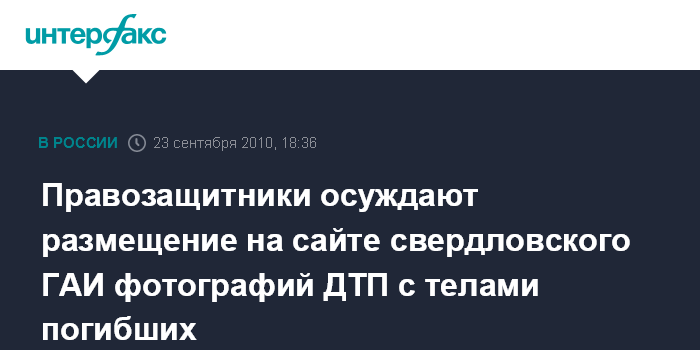 Москва. 23 сентября. INTERFAX.RU - Гражданские активисты просят руководство российского МВД отреагировать на появление на официальном сайте Управления ГАИ по Свердловской области фотографий ДТП с трупами.
