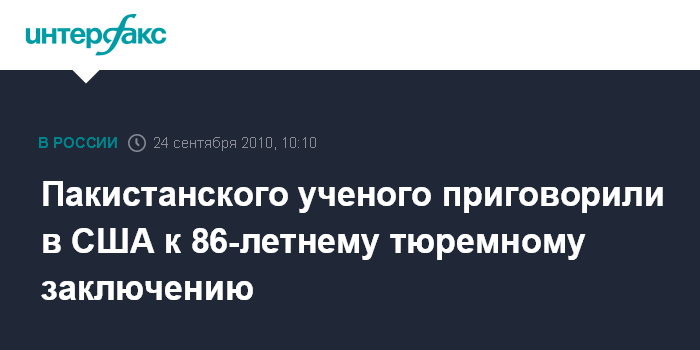 Вашингтон. 24 сентября. INTERFAX.RU - Пакистанский ученый Аафия Сиддики приговорена федеральным окружным судом Манхэттэна к 86-летнему тюремному заключению, сообщает сайт американской газеты The New York Times.