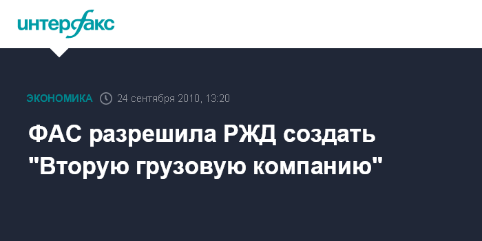 Москва. 24 сентября. INTERFAX.RU - Федеральная антимонопольная служба (ФАС) РФ разрешила ОАО "Российские железные дороги" (РЖД) создать ОАО "Вторая грузовая компания" (ВГК), говорится в сообщении ведомства.