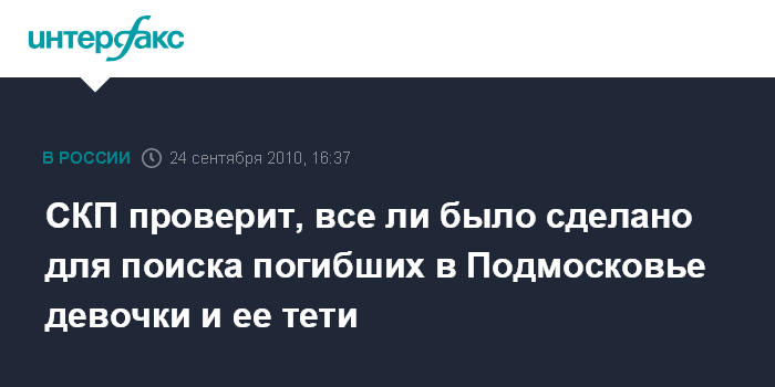 Москва. 24 сентября. INTERFAX.RU - Подмосковное управление СКП по поручению руководства ведомства проверит действия милиции по организации поисков Марии и Елизаветы Фомкиных, заблудившихся в Орехово-Зуевском районе и погибших от холода.