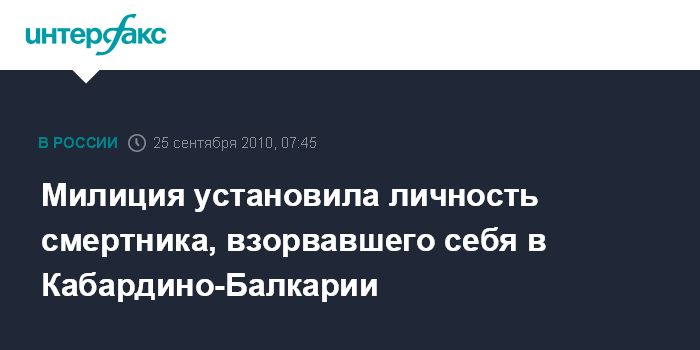 Ростов-на-Дону. 25 сентября. ИНТЕРФАКС-ЮГ - Установлена личность террориста-смертника, обстрелявшего здание отдела УФСБ, а затем подорвавшего себя у здания отдела вневедомственной охраны (ОВО) в городе Нарткала (Кабардино-Балкария).