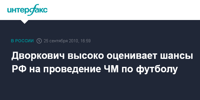 Казань. 25 сентября. INTERFAX.RU - Помощник президента РФ Аркадий Дворкович высоко оценивает шансы России на проведение Чемпионата мира по футболу. "У России хорошие шансы на проведение Чемпионата мира по футболу (2018 или 2022 годов - ИФ), но сильные соперники, и мы боремся за победу", - сказал А.Дворкович журналистам в субботу в Казани.