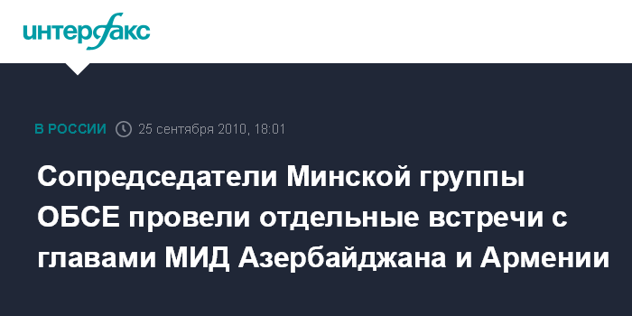 Баку. 25 сентября. INTERFAX.RU - Сопредседатели Минской группы ОБСЕ встретились с министрами иностранных дел Азербайджана Эльмаром Мамедъяровым и Армении Эдвардом Налбандяном, сообщили в субботу государственные азербайджанские СМИ. По их данным, сопредседатели Минской группы ОБСЕ, а также личный представитель действующего председателя ОБСЕ Анжи Каспшик провели с министрами отдельные встречи в Нью-Йорке в кулуарах сессии Генеральной Ассамблеи ООН, в ходе которых проинформировали о подготовке к предстоящей оценочной миссии, которая будет проведена с 4 по 14 октября на территориях вокруг Нагорного Карабаха.