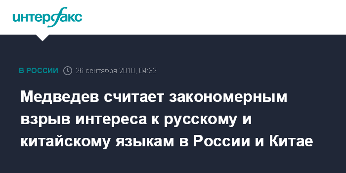 В интервью китайской газете "Жэньминь Жибао" в преддверие визита в КНР, который состоится 26-28 сентября, Д.Медведев отметил, что проходящий сейчас в России Год китайского языка вызывает большой интерес и широкий общественный резонанс. "И это закономерно, ведь граждане нашей страны, особенно молодые, хотят больше знать о Китае, его истории и культуре", - подчеркнул президент РФ.