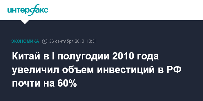 Китай в I полугодии 2010 года увеличил объем инвестиций в РФ почти на 60%
