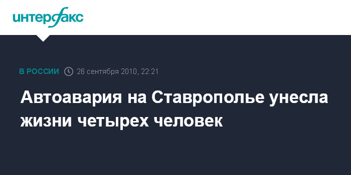 Ставрополь. 26 сентября. ИНТЕРФАКС-ЮГ - Жертвами ДТП на Ставрополье стали четыре человека, сообщил агентству "Интерфакс-Юг" в воскресенье руководитель пресс-службы ГУ МЧС РФ по Ставропольскому краю Олег Дегтярев.