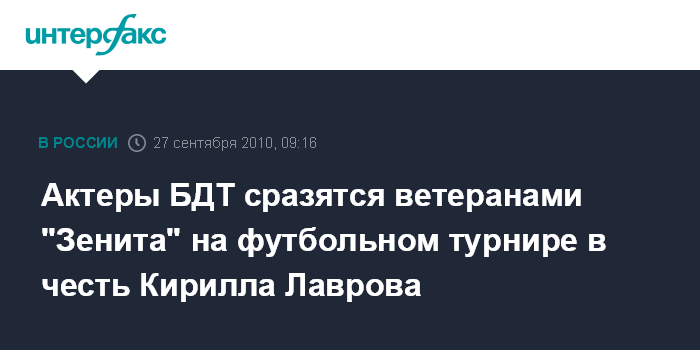 Как сообщает пресс-служба Смольного, в этом году в турнире на кубок им.К.Лаврова примут участие 10 "театральных" футбольных команд, а также игроки ФК "Зенит", ставшие чемпионами СССР в 1984 году.